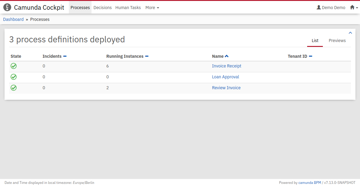Now use Cockpit to check if the process is successfully deployed. Go to http://localhost:8080/cadenzaflow/app/cockpit. Log in with demo / demo. Your process Loan Approval is visible on the dashboard.