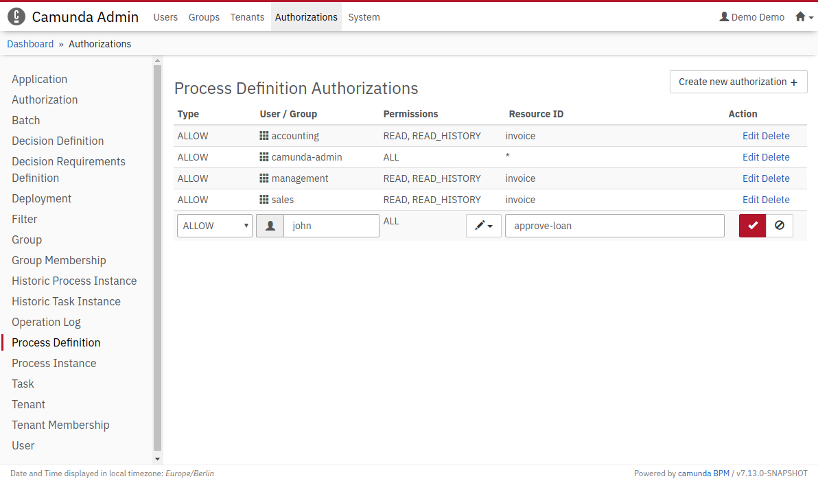 To allow the user john to see the process definition Loan Approval, you have to go to Cadenzaflow Admin (http://localhost:8080/cadenzaflow/app/admin/default/#/authorization?resource=6). Next, click on the button Create new authorization to add a new authorization on the resource process definition. Now you can give the user john all permissions on process definition approve-loan. When you are done, submit the new authorization.