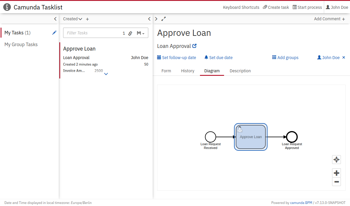 Log out of Admin. Go to Tasklist (http://localhost:8080/cadenzaflow/app/tasklist) and log back in with the user credentials “john / john”. Now you see the Approve Loan task in your Tasklist. Select the task and click on the Diagram tab. This displays the process diagram highlighting the User Task that is waiting for you to work on it.