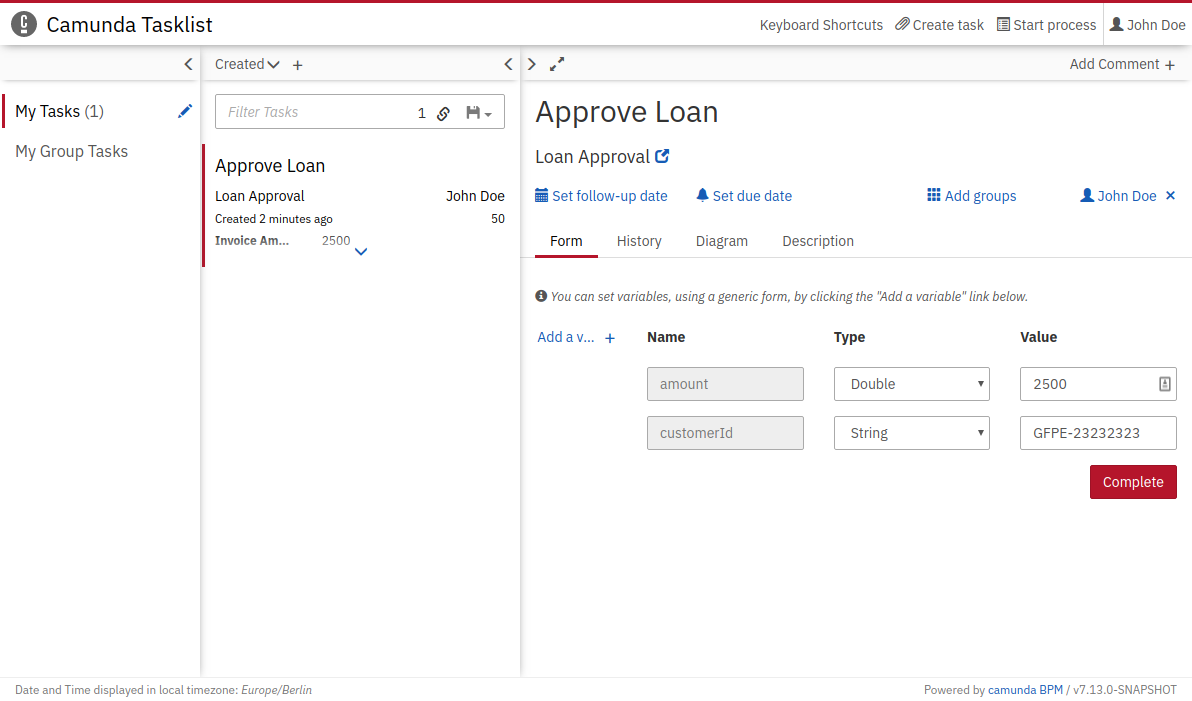 Next, go to Cadenzaflow Tasklist (http://localhost:8080/cadenzaflow/app/tasklist). Click on the button to start a process instance. This opens a dialog where you can select Loan Approval from the list. Now you can set variables for the process instance using a generic form.