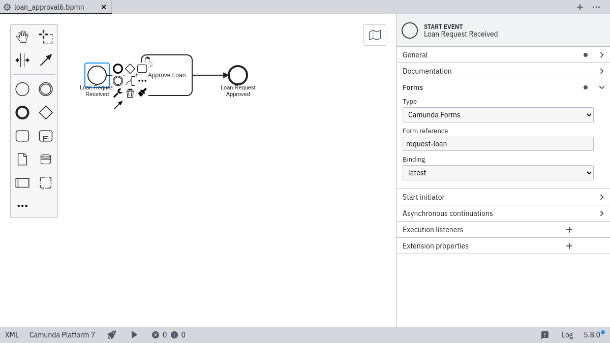 Open the process with the modeler. Click on the start event. In the properties panel, click on Forms select CadenzaFlow Forms as type, insert request-loan into the Form reference field, and choose latest as binding. This means Tasklist uses the latest deployed version of the form. Save the diagram and refresh the Eclipse project.