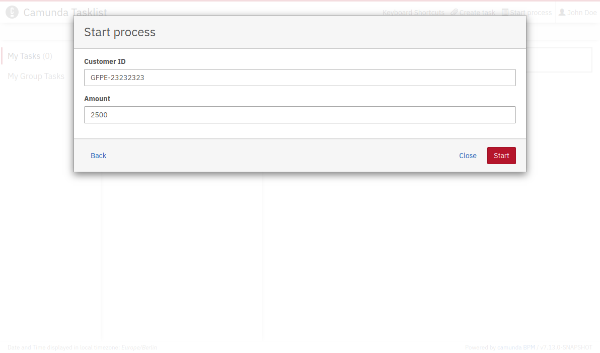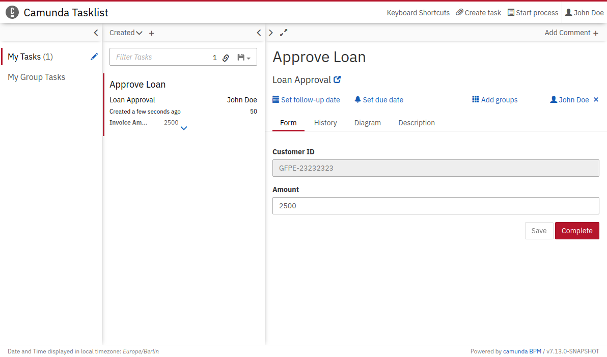 Now you go to Tasklist and start a new process instance for the loan approval process. You will notice that the custom form is displayed.