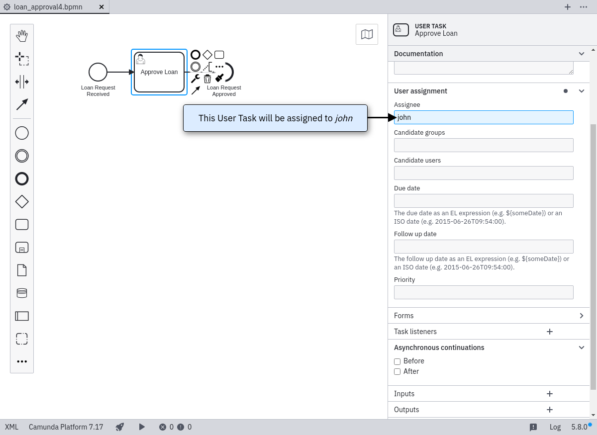 Select the User Task on the canvas. This updates the selection in the properties view. Scroll to the property named Assignee.