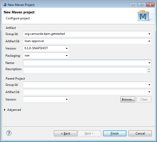 When you are done, click Finish. Eclipse sets up a new Maven project. The project appears in the Project Explorer View.