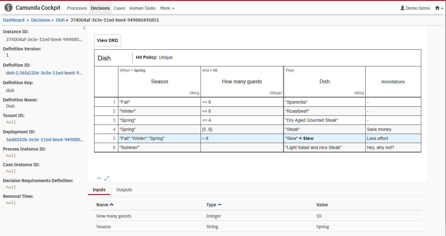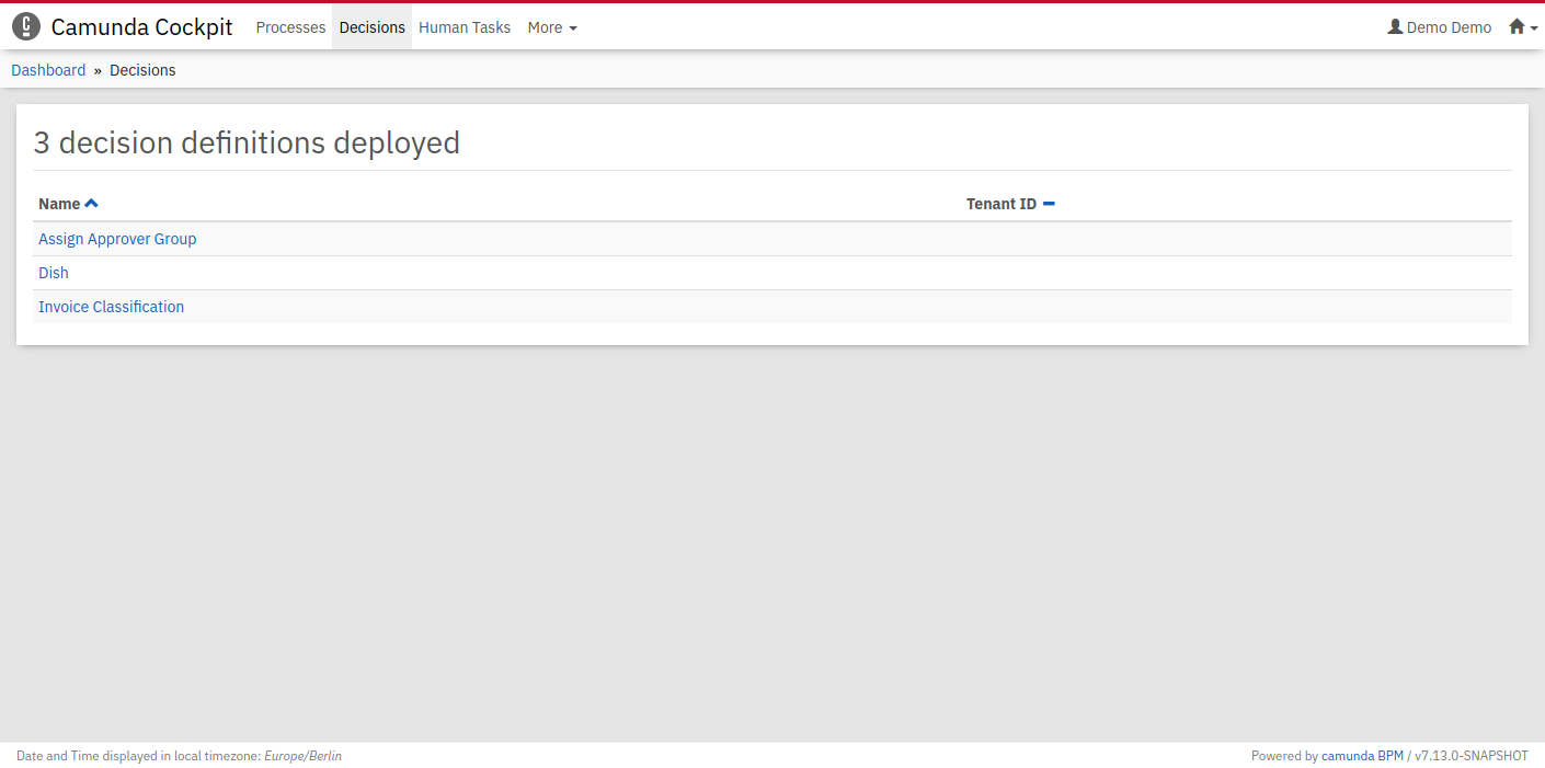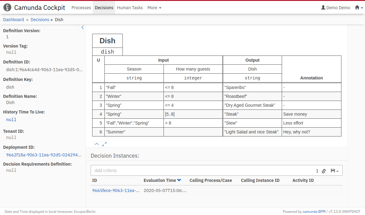 Now, use Cockpit to check if the decision table is successfully deployed. Go to http://localhost:8080/cadenzaflow/app/cockpit. Log in with demo / demo. Go to “Decisions” section. Your decision table Dish should be listed as deployed decision definition.