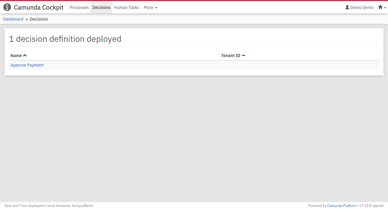 Now, use Cockpit to see if the decision table was successfully deployed. Go to http://localhost:8080/cadenzaflow/app/cockpit/. Log in with the credentials demo / demo. Navigate to the “Decisions” section. Your decision table Approve Payment should be listed as deployed decision definition.