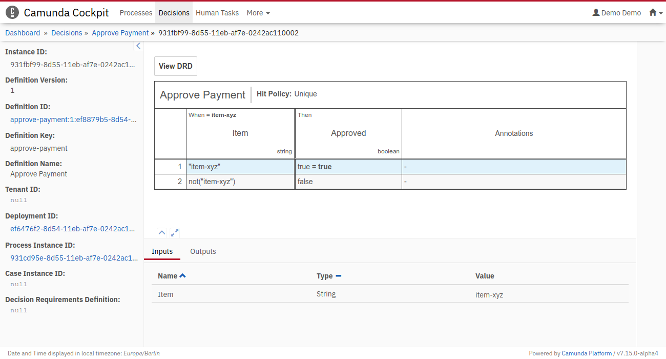 You’ll see that depending on the input, the worker will either charge or not charge the credit card. You can also verify that the DMN tables were evaluated by using CadenzaFlow Cockpit. Go to http://localhost:8080/cadenzaflow/app/cockpit/. Log in with the credentials demo / demo. Navigate to the “Decisions” section and click on Approve Payment. Check the different Decision Instances that were evaluated by clicking on the ID in the table.