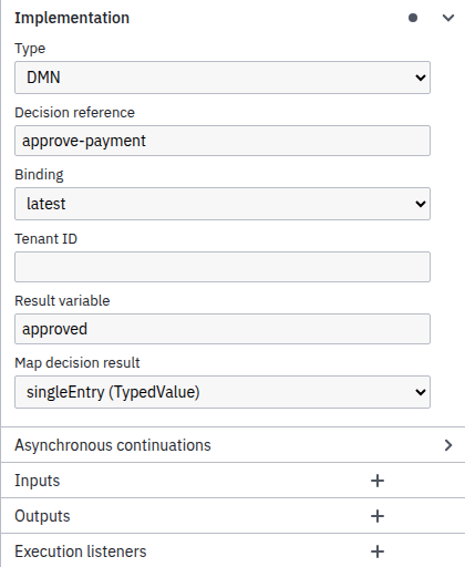 Next, link the Business Rule Task to a DMN table by changing Implementation to DMN and Decision Ref to approve-payment in the properties panel. In order to retrieve the result of the evaluation and save it automatically as a process instance variable in our process, we also need to change the Result Variable to approved and use singleEntry as the Map Decision Result in the properties panel.