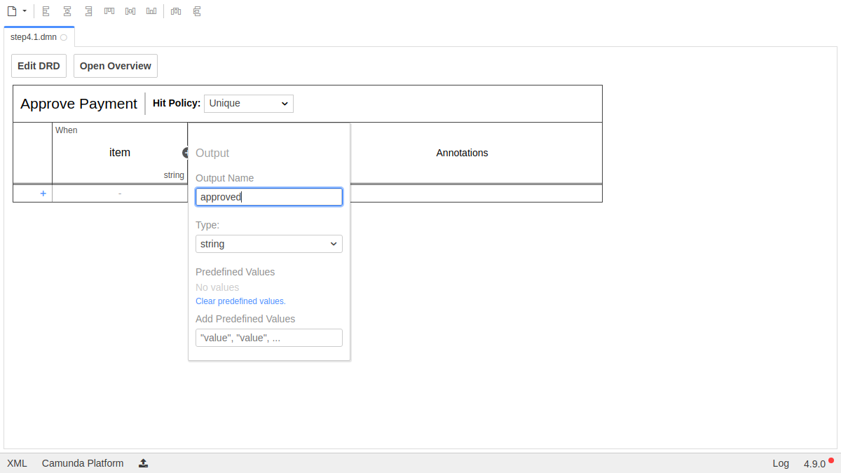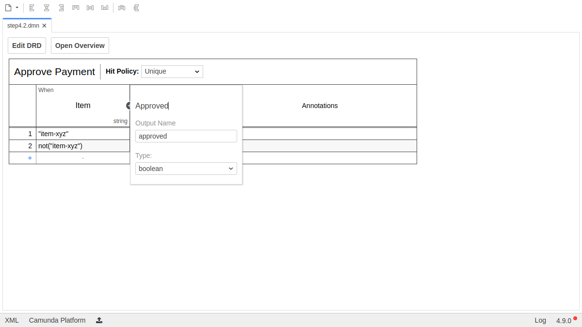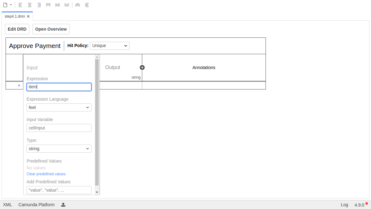 First, specify the input expressions for the DMN table. In this example, we’ll decide whether a payment is approved based on the item name. Your rules can also make use of the FEEL Expression Language, JUEL or Script. If you like, you can read more about Expressions in the DMN Engine.