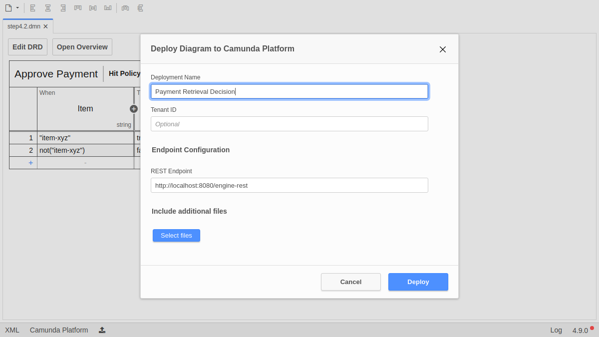 To deploy the Decision Table, click on the Deploy button in the CadenzaFlow Modeler, give it Deployment Name “Payment Retrieval Decision”, then hit the Deploy button.