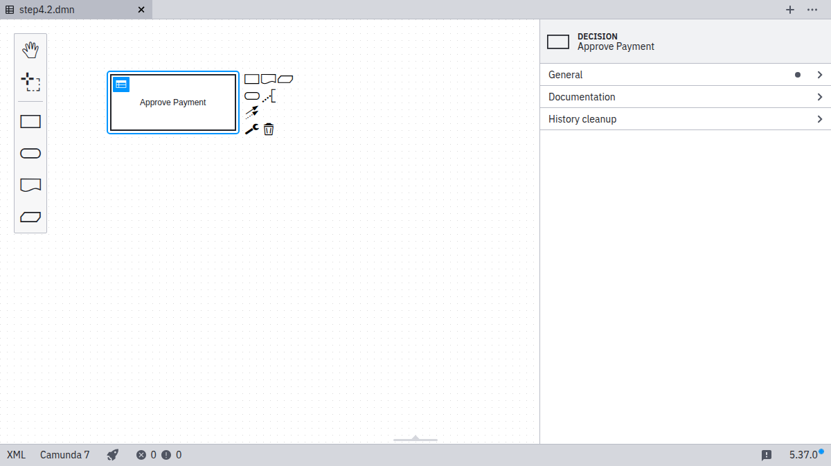 Now the newly created diagram will already have a decision element added to it. Select it by clicking it and then give it a name of Approve Payment and an ID of approve-payment (the decision ID must match the the Decision Ref in your BPMN process).
