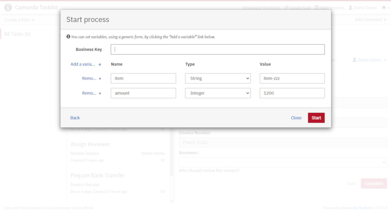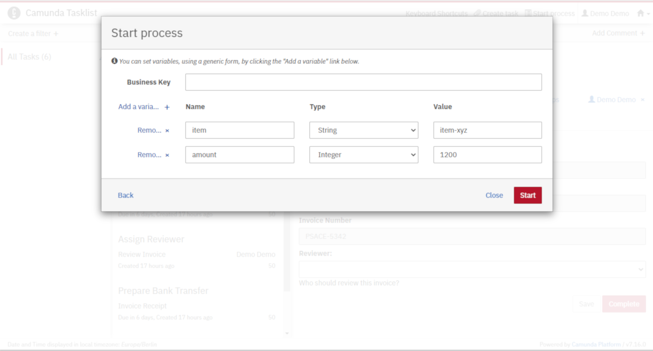 Next, use Tasklist to start two new Process Instances and verify that depending on your input, the Process Instance will be routed differently. To do so, go to http://localhost:8080/cadenzaflow/app/tasklist/. Log in with demo / demo.