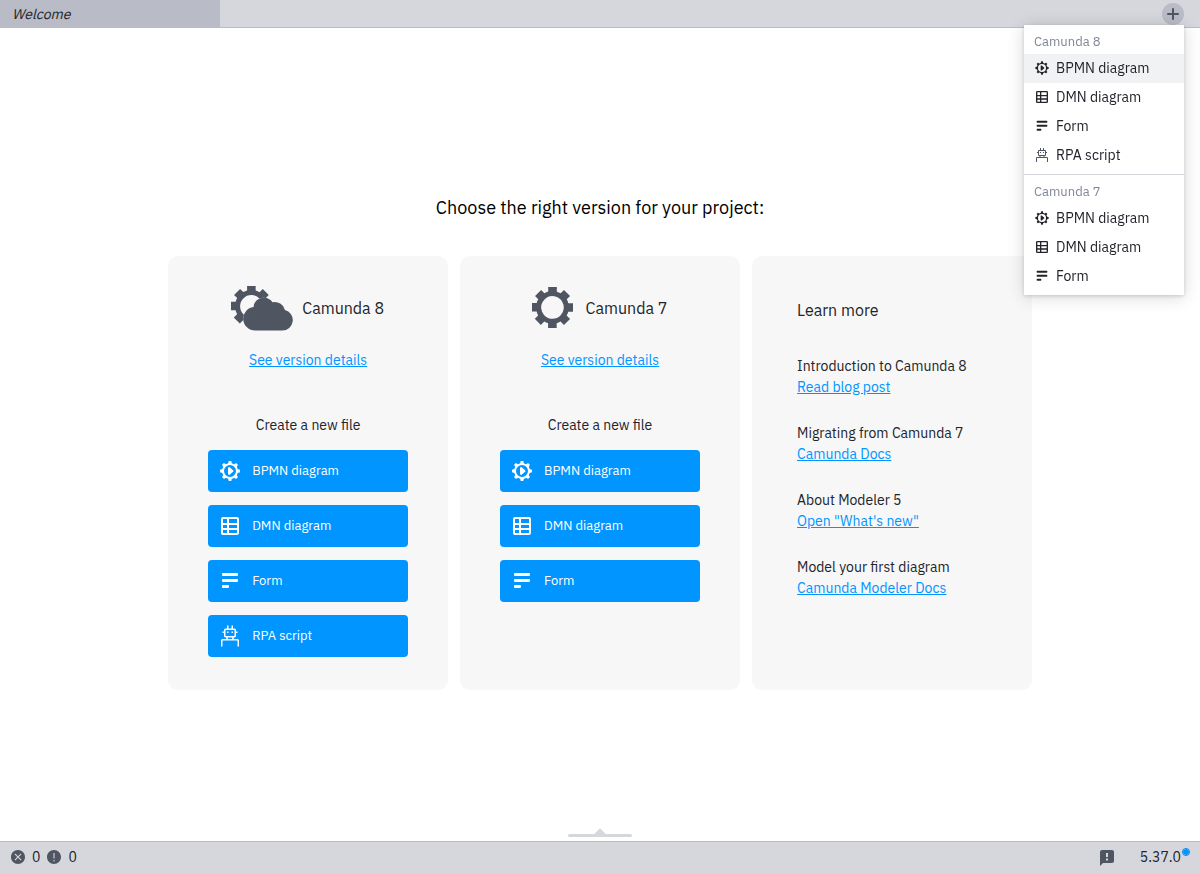 Create a new BPMN diagram by clicking File > New File > BPMN Diagram (CadenzaFlow Platform).