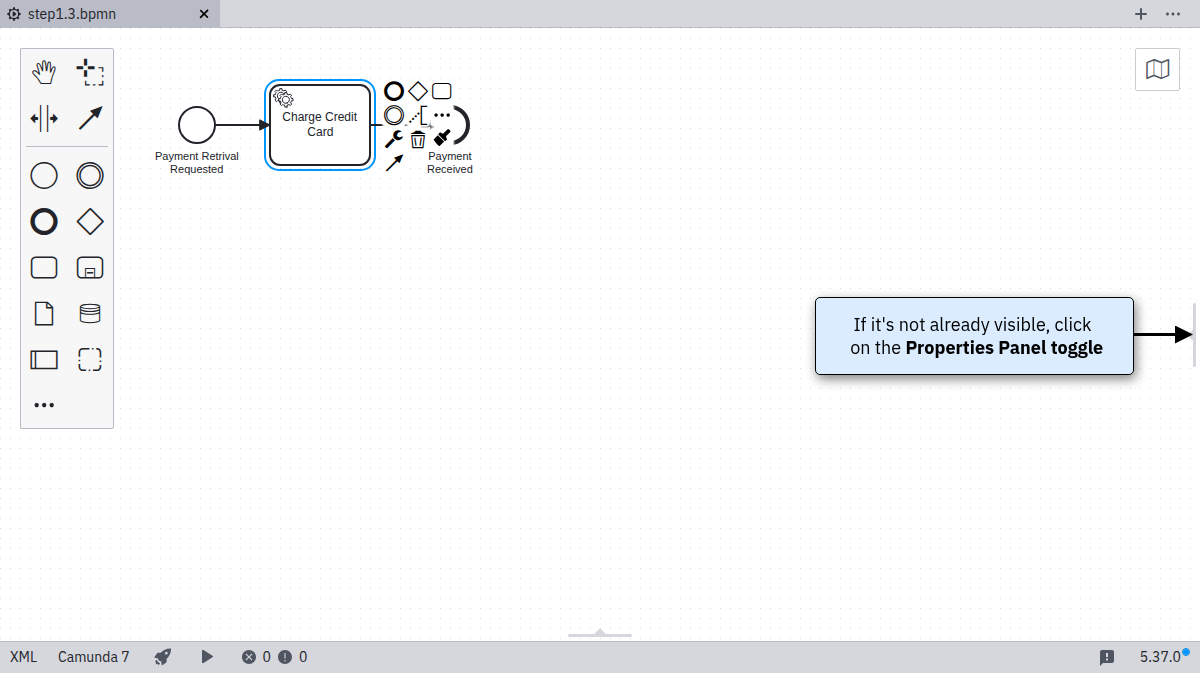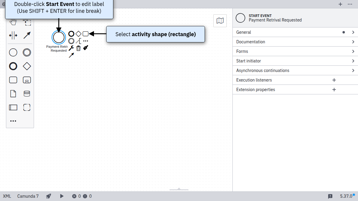 Double-click on the Start Event. A text box will open. Name the Start Event “Payment Retrieval Requested”.