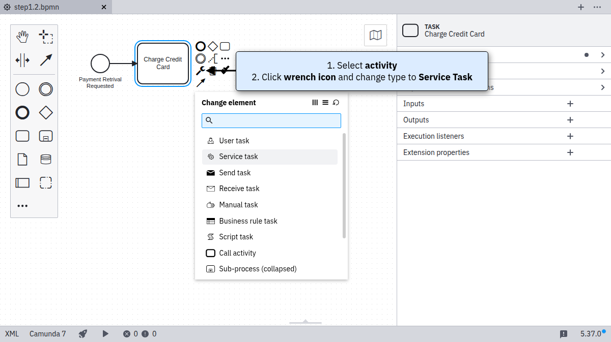 Click on the start event. From its context menu, select the activity shape (rounded rectangle). It will be placed automatically on the canvas, and you can drag it to your preferred position. Name it Charge Credit Card. Change the activity type to Service Task by clicking on the activity shape and using the wrench button.