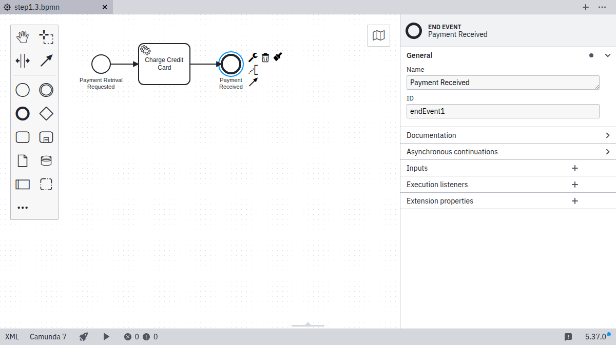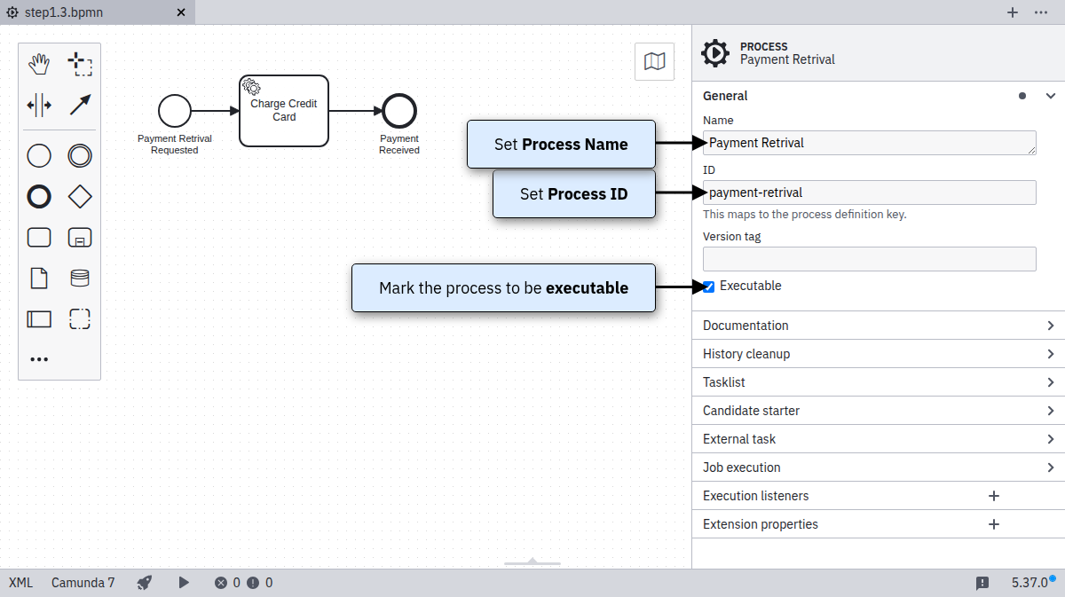 Because we’re modeling an executable process, we should give it an ID and set the isExecutable property to true. On the right-hand side of the canvas, you find the properties panel. When you click on empty space on the modeling canvas, the properties panel will display the properties of the process itself.