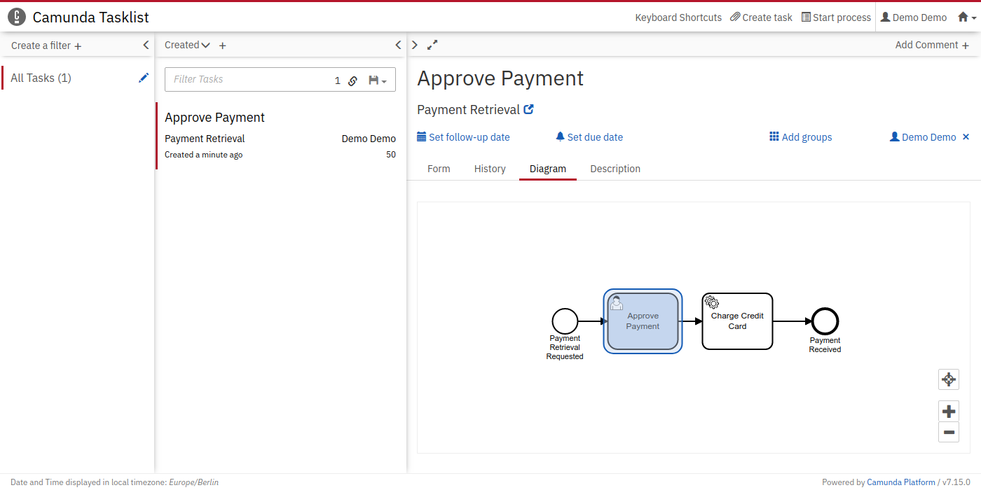 You should now see the Approve Payment task in your Tasklist. Select the task and click on the Diagram tab. This displays the process diagram highlighting the User Task that’s waiting to be worked on.