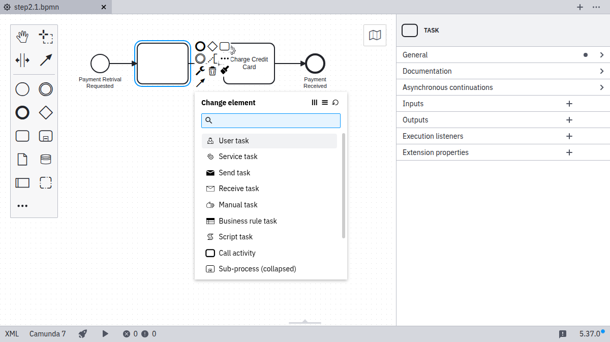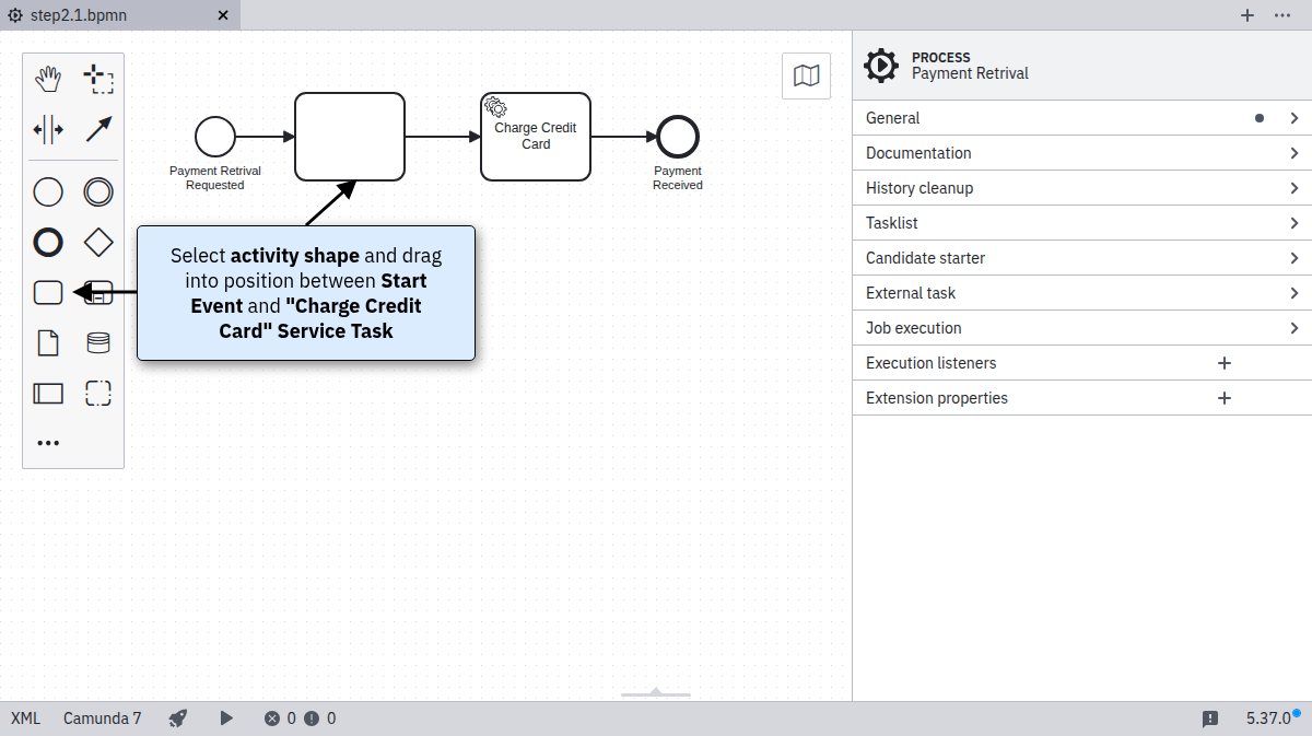 Select the create/remove space tool (<||>) from the Modeler’s left-hand menu, and use it to create space between the Start Event and the “Charge Credit Card” Service Task (click and drag the cursor to the right).