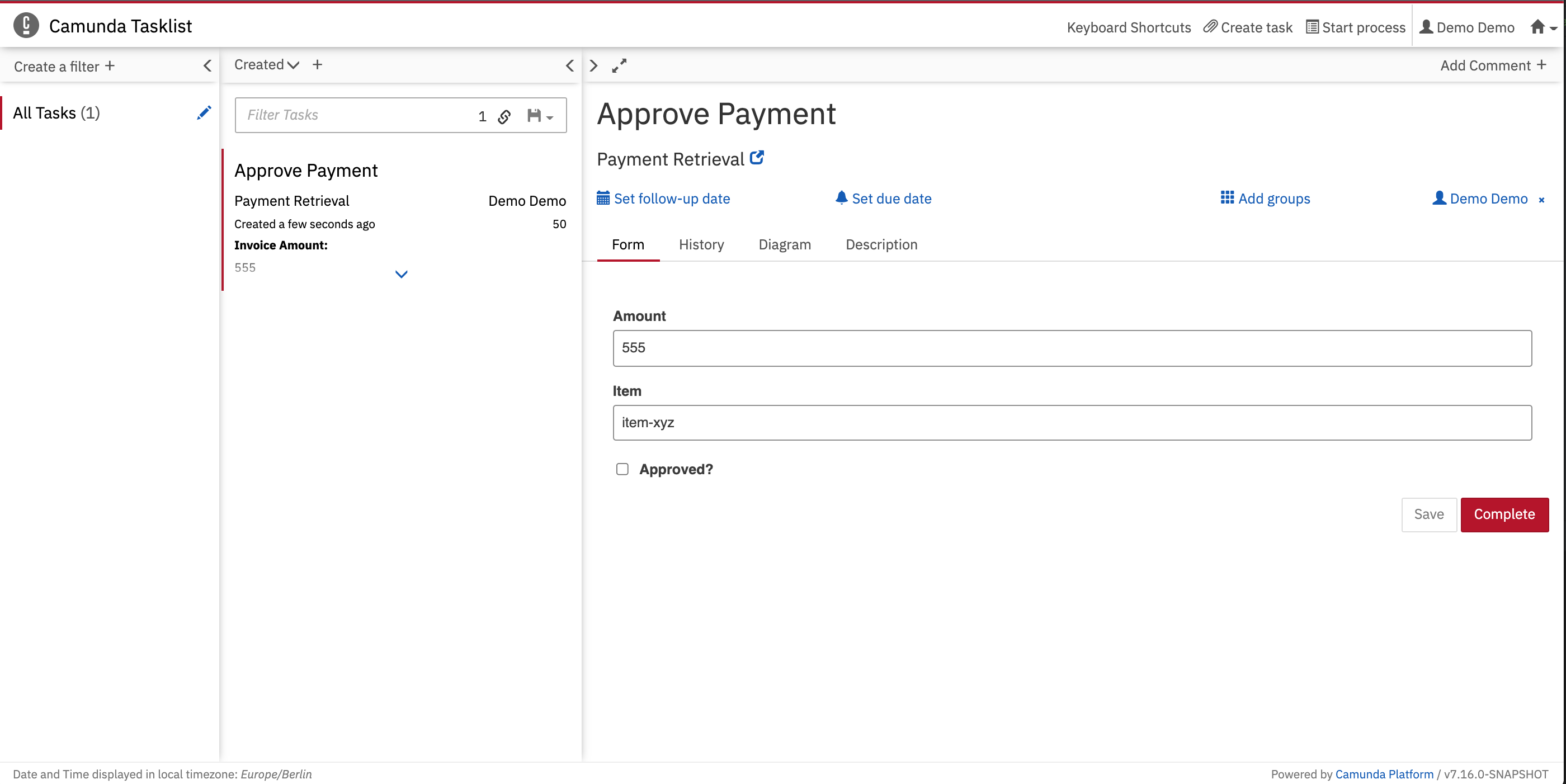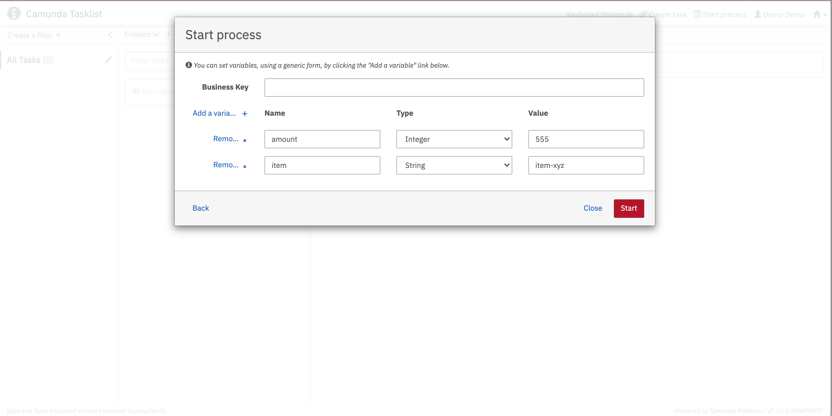 Go to Tasklist (http://localhost:8080/cadenzaflow/app/tasklist/) and log in with the credentials “demo / demo”. Click on the button to start a process instance. This opens a dialog where you can select Payment Retrieval from the list. Now you can set variables for the process instance using a generic form.
