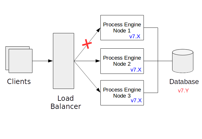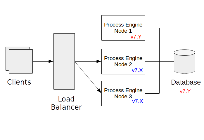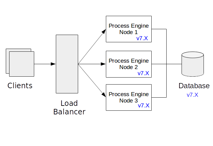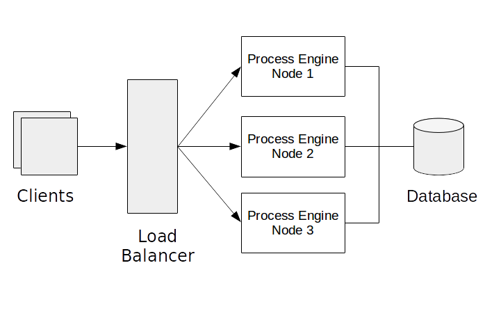 The above picture displays an example system. There are three process engine nodes connected to a shared database. A load balancer distributes requests to the Process Engine nodes. “Process Engine node” shall be an instance of an application or application server hosting a process engine. It must not necessarily be a separate physical host.