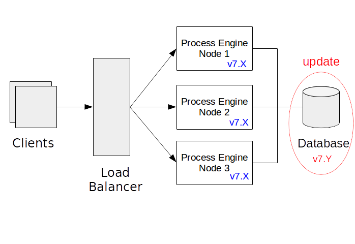 To facilitate updates, CadenzaFlow ensures backwards compatibility of the database schema. Backwards compatibility makes it possible to operate an older version of the process engine on a newer version of the database schema. This property is crucial in the first step of the rolling update process: after the database has been updated, the process engine libraries are still at the previous version.