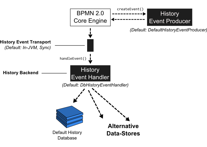 Note that if you provide a custom implementation of the HistoryEventHandler and wire it to the process engine, you override the default DbHistoryEventHandler. The consequence is that the process engine will stop writing to the history database and you will not be able to use the history service for querying the audit log. If you do not want to replace the default behavior but only provide an additional event handler, you can use the class org.cadenzaflow.bpm.engine.impl.history.handler.CompositeHistoryEventHandler that dispatches events to a collection of handlers.