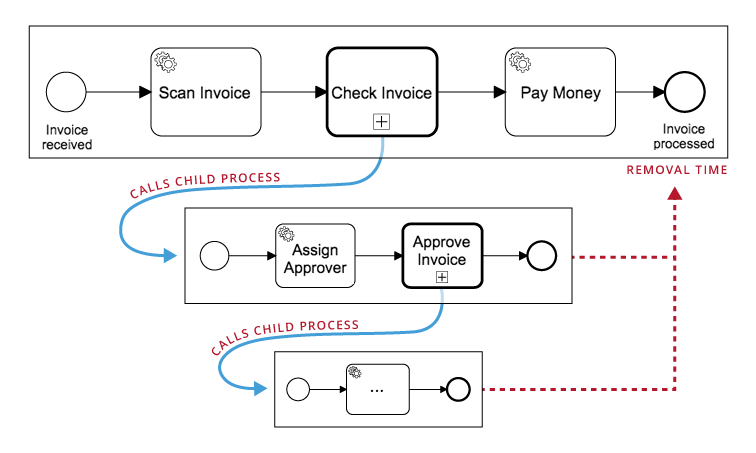 For process and decision instances in a hierarchy (e.g. a process instance that is started by another process instance via a BPMN Call Activity), the removal time of all instances is always equal to the removal time of the root instance.