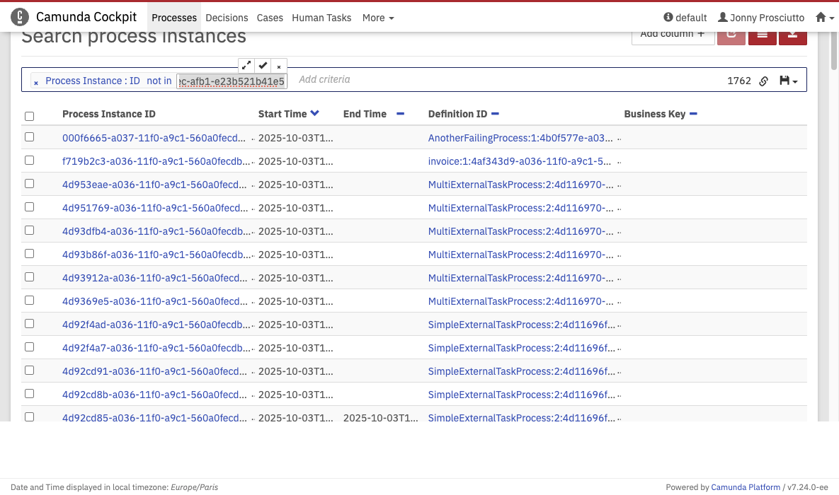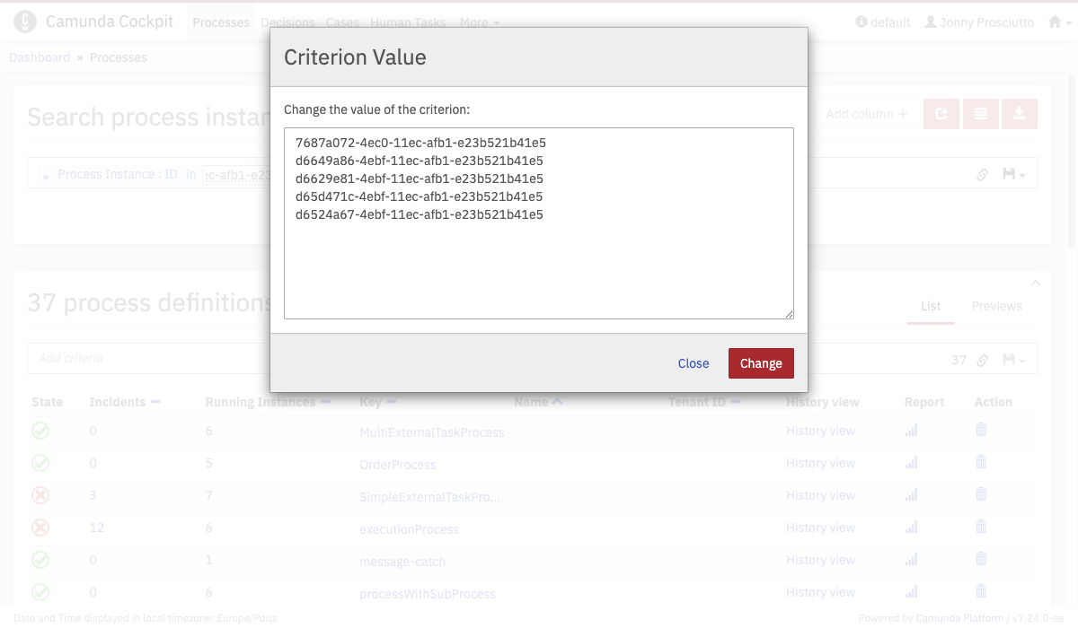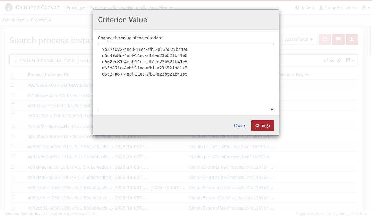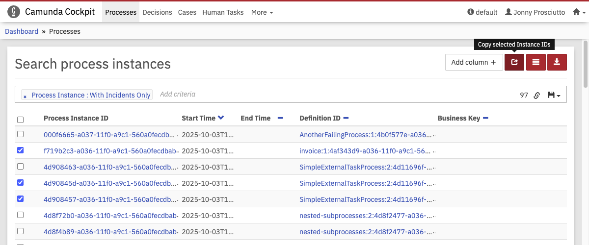 Sometimes incidents make it necessary for the Operations Engineer to intervene manually. To make it easier to work with a subset of Process Instances it is possible to copy the IDs of the selected Process Instances using the Copy selected Process Instances IDs button: