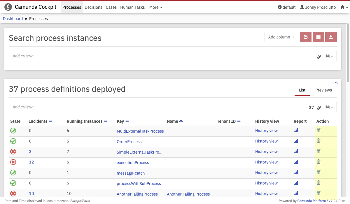 The processes dashboard of Cockpit is the entry point for process monitoring. It comes with a pre-installed plugin, which lets you see deployed process definitions. Additional plugins can be added to the processes dashboard.