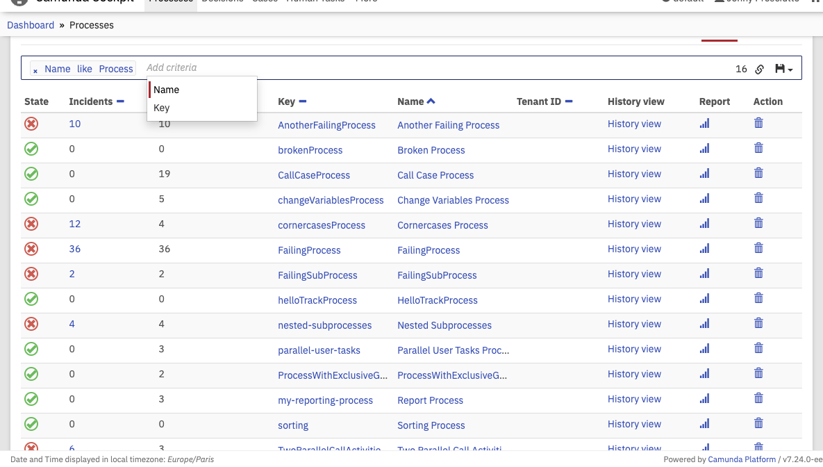 With the search component above the table, you can search for deployed processes by their name or key. To do so, click in the search box and select the property. Both of these search properties support the ’like’ operator, which allows searching for process definitions where the entered value is a substring of the property value.