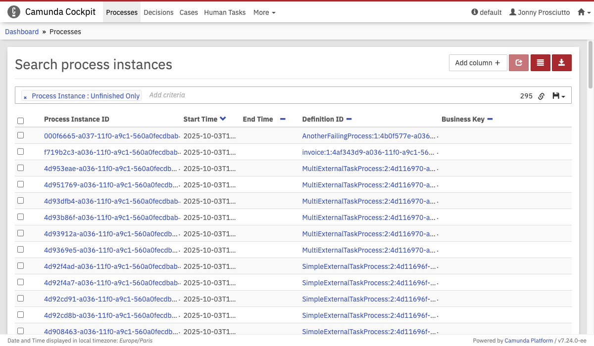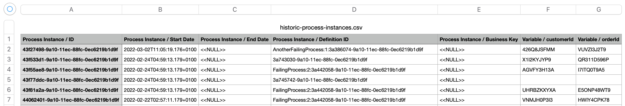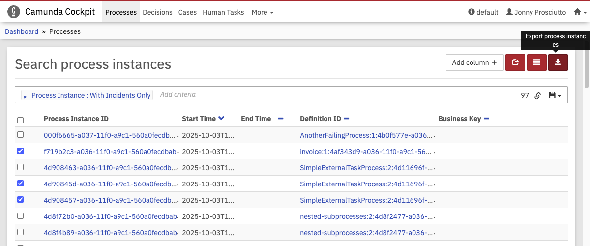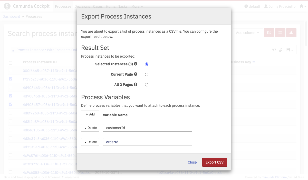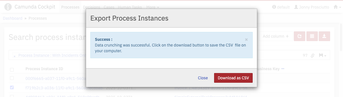 Sometimes incidents make it necessary for the Operations Engineer to intervene manually. However, these incidents might not always be solvable from Cockpit if other services or systems are involved. For this case, Cockpit provides a feature to export affected process instances and their process variable values as CSV spreadsheets. The export feature helps to communicate efficiently with other system owners.