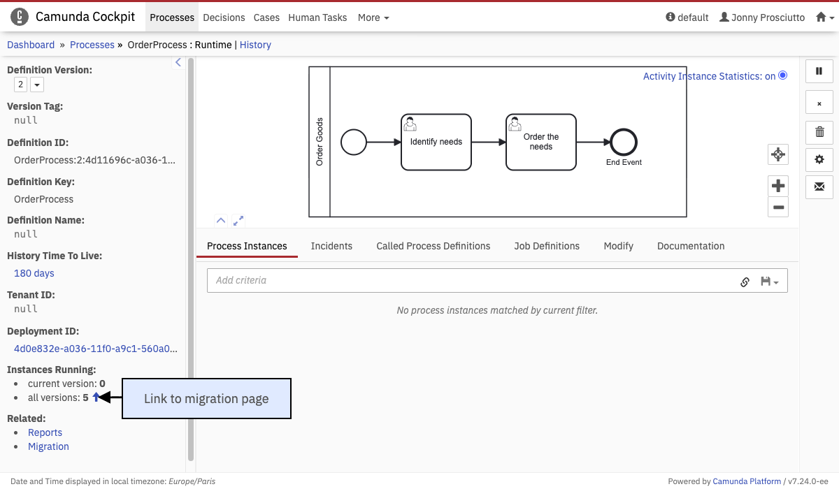 You can migrate running process instances from their current process definition version to another version of that definition or another process definition altogether. You can access the migration page by navigating to the process definition or instance view of a process with multiple versions.