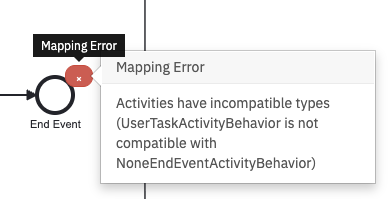 If you create a mapping that is incorrect, a red error indicator is displayed in the top right corner of the source and target activity of the faulty mapping. Clicking on the error indicator opens a tooltip showing details of the error.
