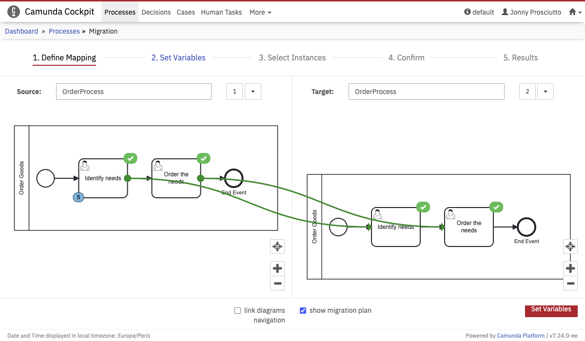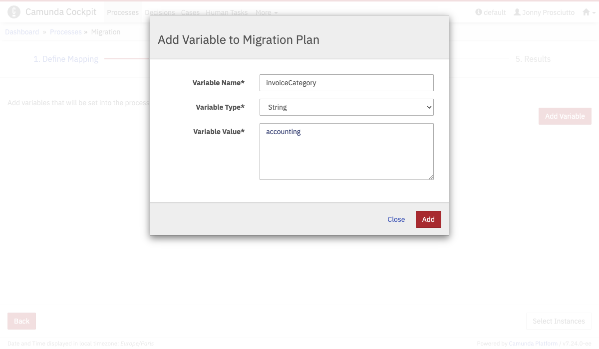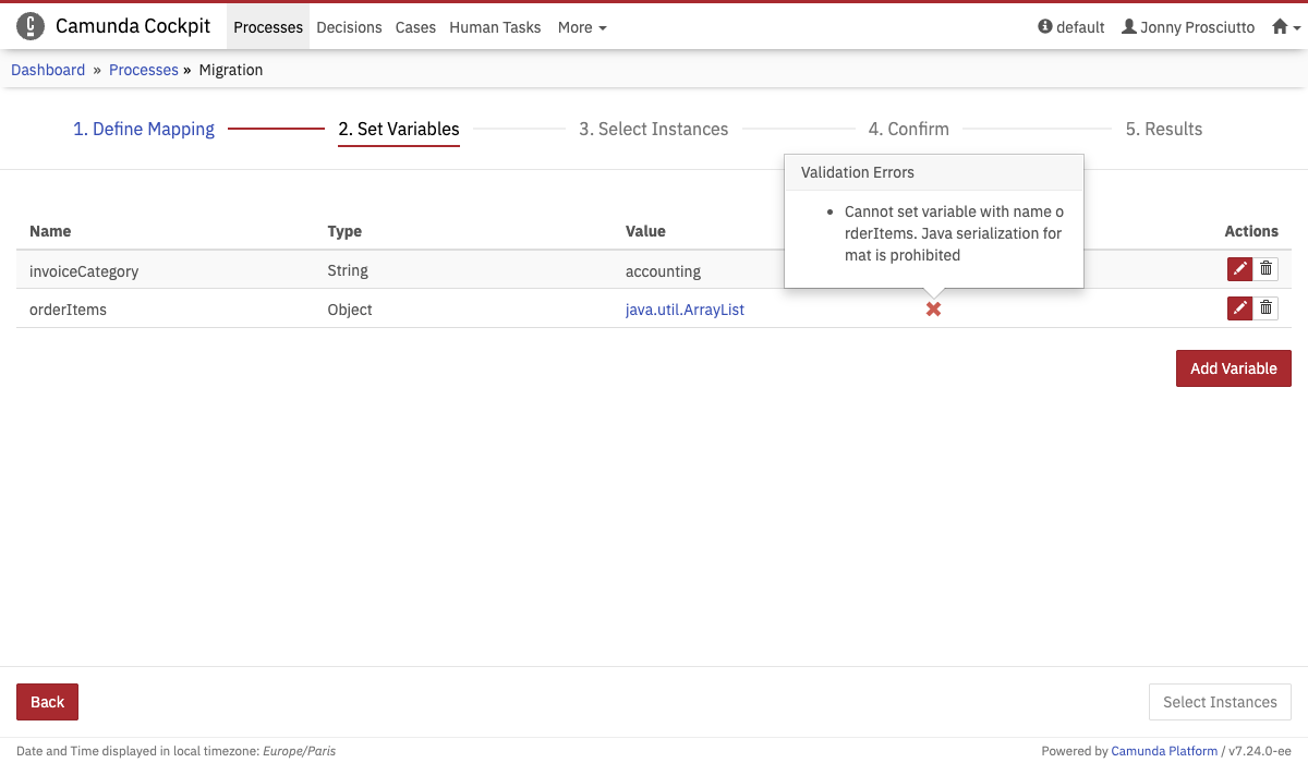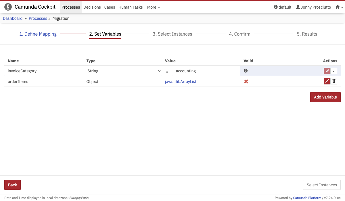 You can still edit the variables you have just added. For instance, if a variable invalidates the migration plan, you can easily correct it to proceed with the process instance migration.
