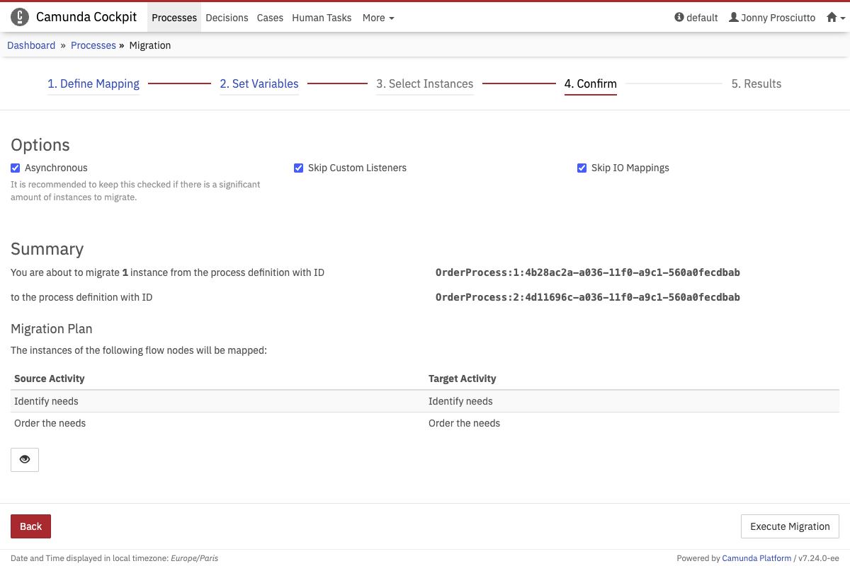 In the next step, you see an overview of the migration that you are about to execute. This page displays the exact id of the source and target process definition as well as the number of process instances you are about to migrate. It also contains a tabular display of the migration plan. You can configure options for the migration such as whether the migration should be performed asynchronously as a batch and whether custom listeners and IO mappings should be skipped.