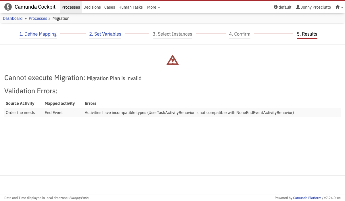 If the migration plan contains errors, they are displayed on this page. No instances are migrated in this case. You can go back to the first step to fix the errors.