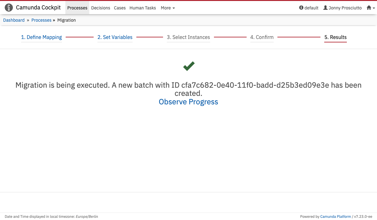 After clicking Execute Migration, the result screen is displayed. If the migration was performed successfully, that is indicated on this page. For asynchronous migrations, a link to the batch page is displayed where the progress of the batch can be observed.