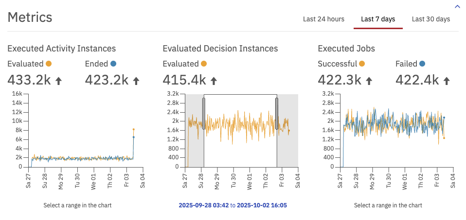 At the bottom of the dashboard, the metrics plugin displays graphs with metrics for executed activity instances, evaluated decision instances and executed jobs. You can select to display the details for the current day, the current week or the current month. By clicking on the metrics graphs and dragging the cursor in either direction, you can select a specified range of time. You can also modify the range of time by using the mouse wheel. By clicking on the link that appears under the graph, you are forwarded to the respective search with preselected query parameters.