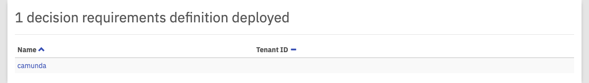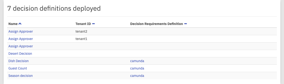 This plugin provides you with a list of deployed decision definitions. You can click on the name of a decision to go to the decision definition view and access more details, like the DMN table or executed decision instances view. You can also click on the name of a decision requirements definition to go to the decision requirements definition view.
