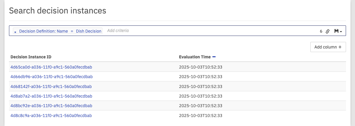 At the top of the dashboard, you can search for decision instances which fulfill certain search criteria. To do so, click in the search box and select the parameters to search for. You can also begin typing to find the required parameter faster. Depending on the selected property, you have to specify the value of the property. You can combine multiple search pills to narrow down the search results.