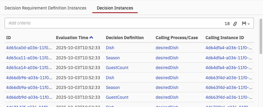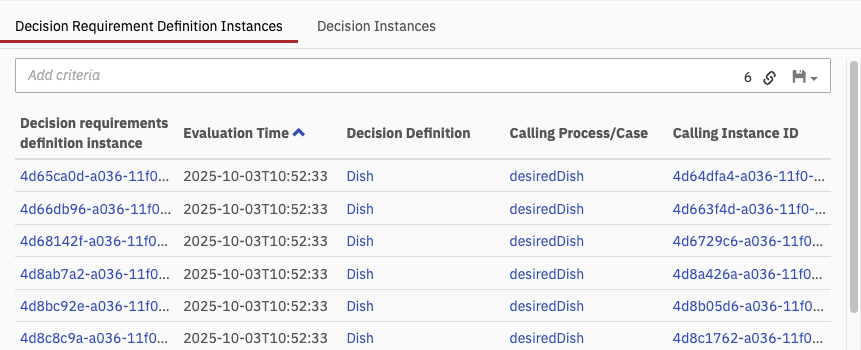 Clicking on the links takes you to the respective pages. The same principle also applies to case definitions and case instances. Clicking on the ID of the instance takes you to the decision requirements definition instance view. Clicking on the decision definition takes you to the decision definition view