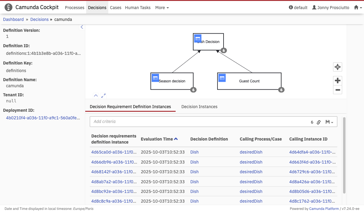 Below the diagram you find the decision instances tab and the decision requirements definition instances tab.