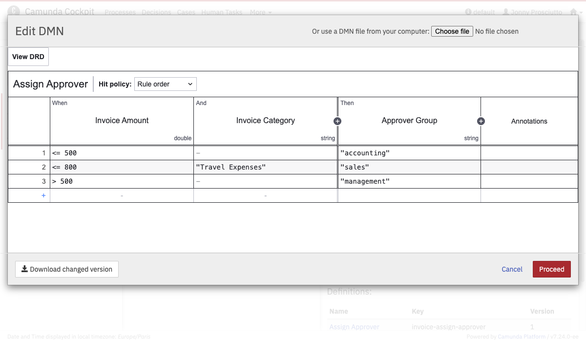 You can use a local DMN file from your computer to overwrite the table. Clicking on the Choose File button opens a dialog where you can select a DMN file. The file ending must be .dmn or .dmn11.xml. After selecting the file, the table gets replaced. You can then perform additional changes to the table before deploying it.