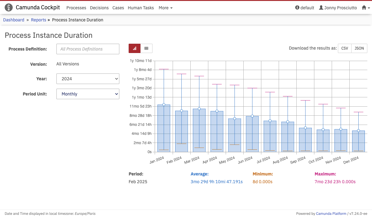 This report shows the average, minimum and maximum duration for a selected process definition and version for a given timeframe. Monthly and quarterly aggregation of the duration times are supported. You can hover over a bar in the bars chart to see the exact values below the chart. You can also switch to the table view to see the exact values for every month or quarter.