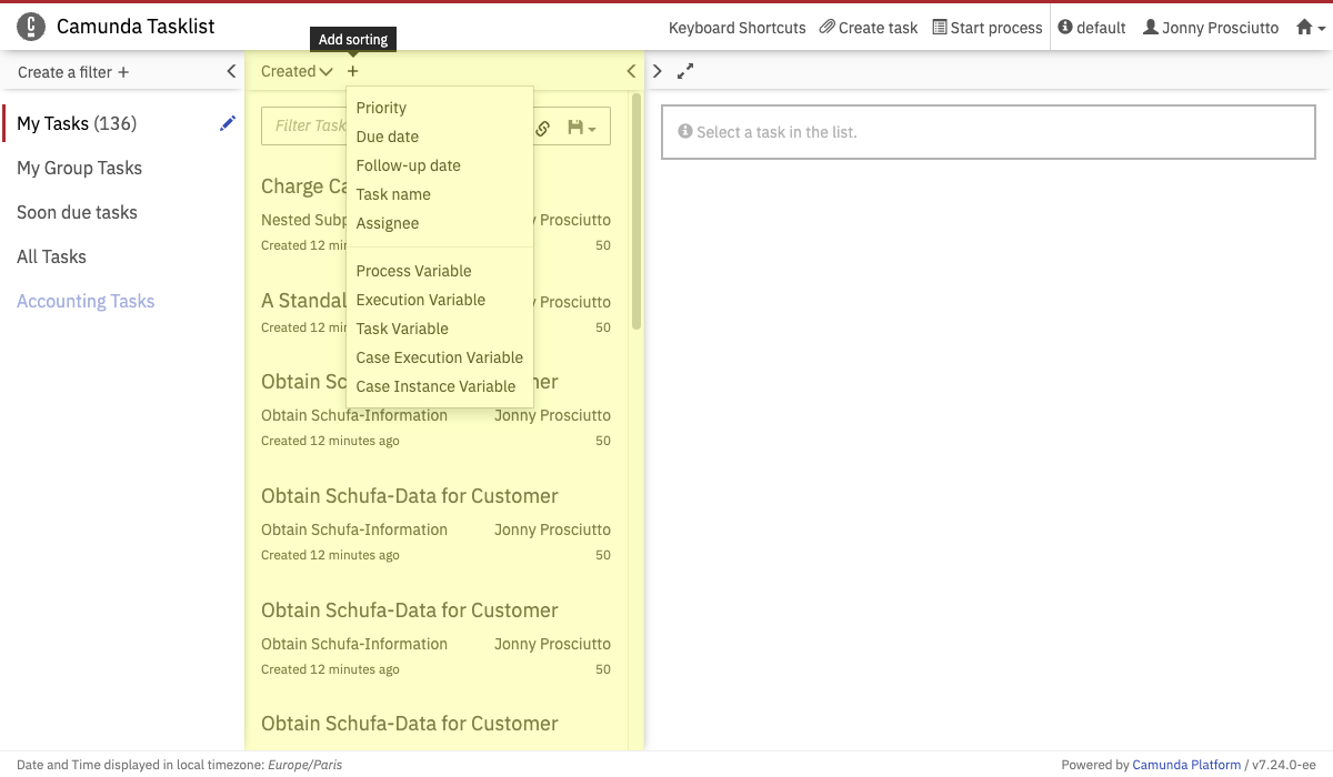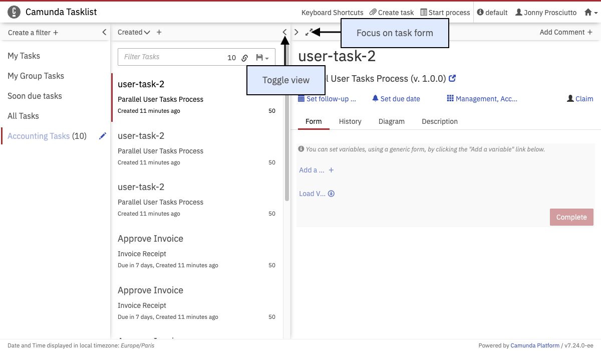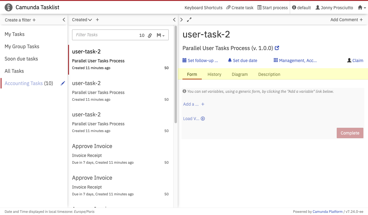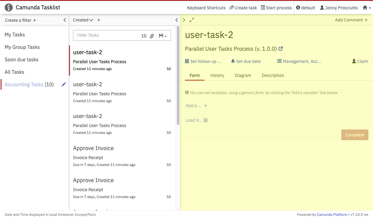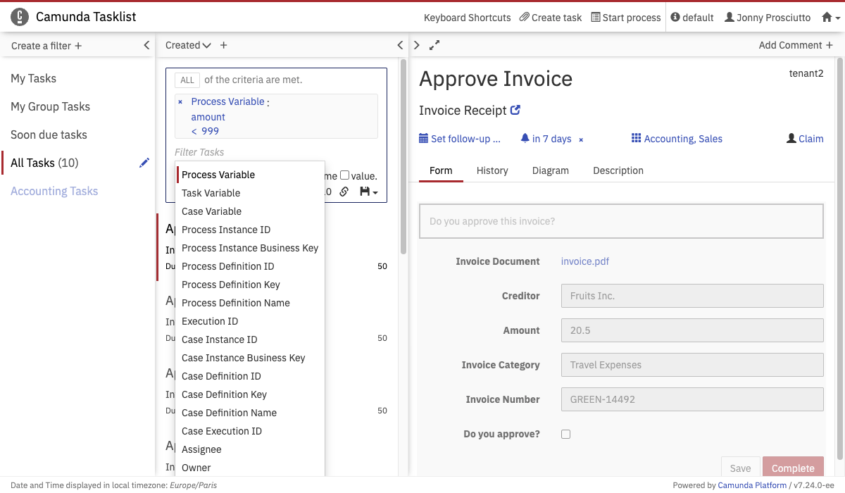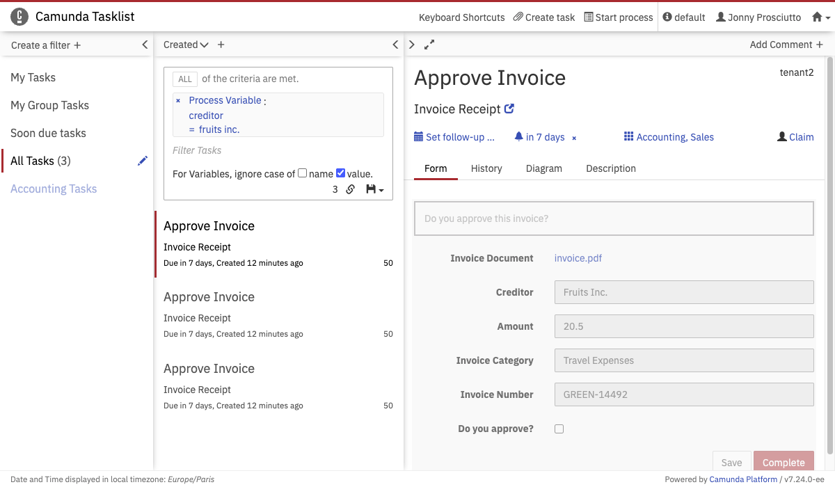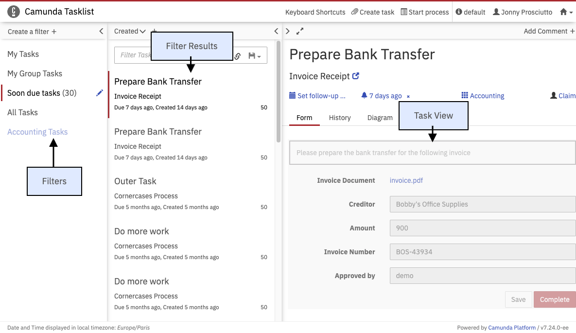On the dashboard of Tasklist you see an overview of pending tasks. On the left side of the screen, an overview of the filters is displayed. On the upper right side of the screen, you can set a follow-up or due date, you can claim, unclaim and reassign tasks and you can add comments. Underneath that section, the embedded form is displayed (please note that external task forms cannot be displayed here), you can switch to the task history, you can see the diagram view or you can view the description of the user task.