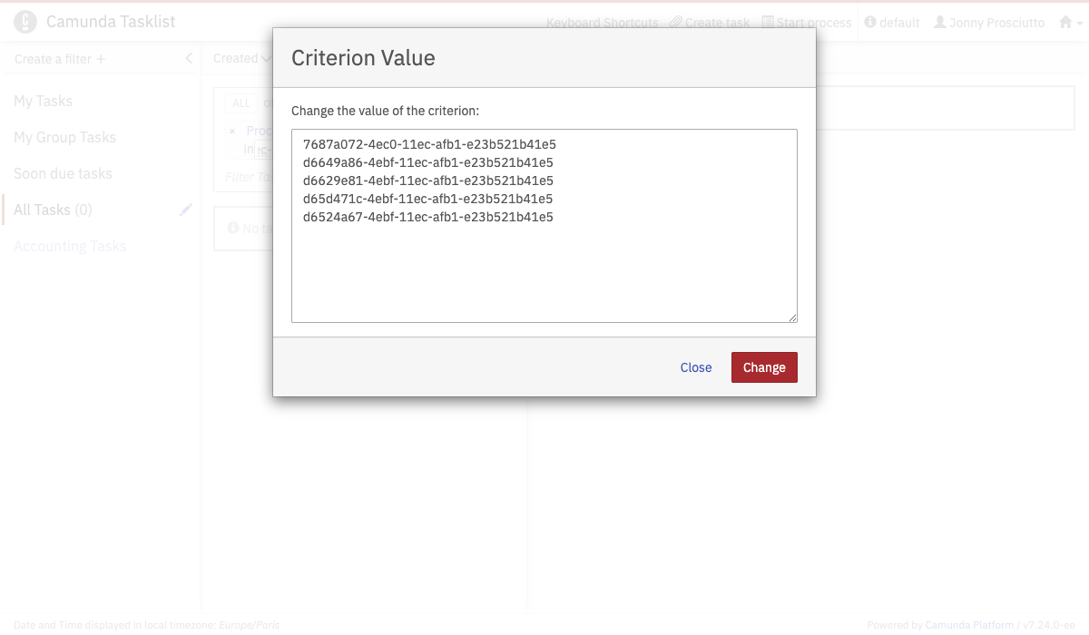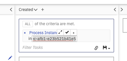 Above the filter results, you have the option of searching for user tasks within the selected filter results. To do so, click in the search box and select the parameters to search for. You can also begin typing to find the required parameter faster. Depending on the selected property, you have to specify the value of the property. Some properties also allow operators other than equal, e.g., 'like', which allows to search for a task where the entered value is a substring of the property value. The 'in' operator allows you to provide a comma-separated list of possible values.