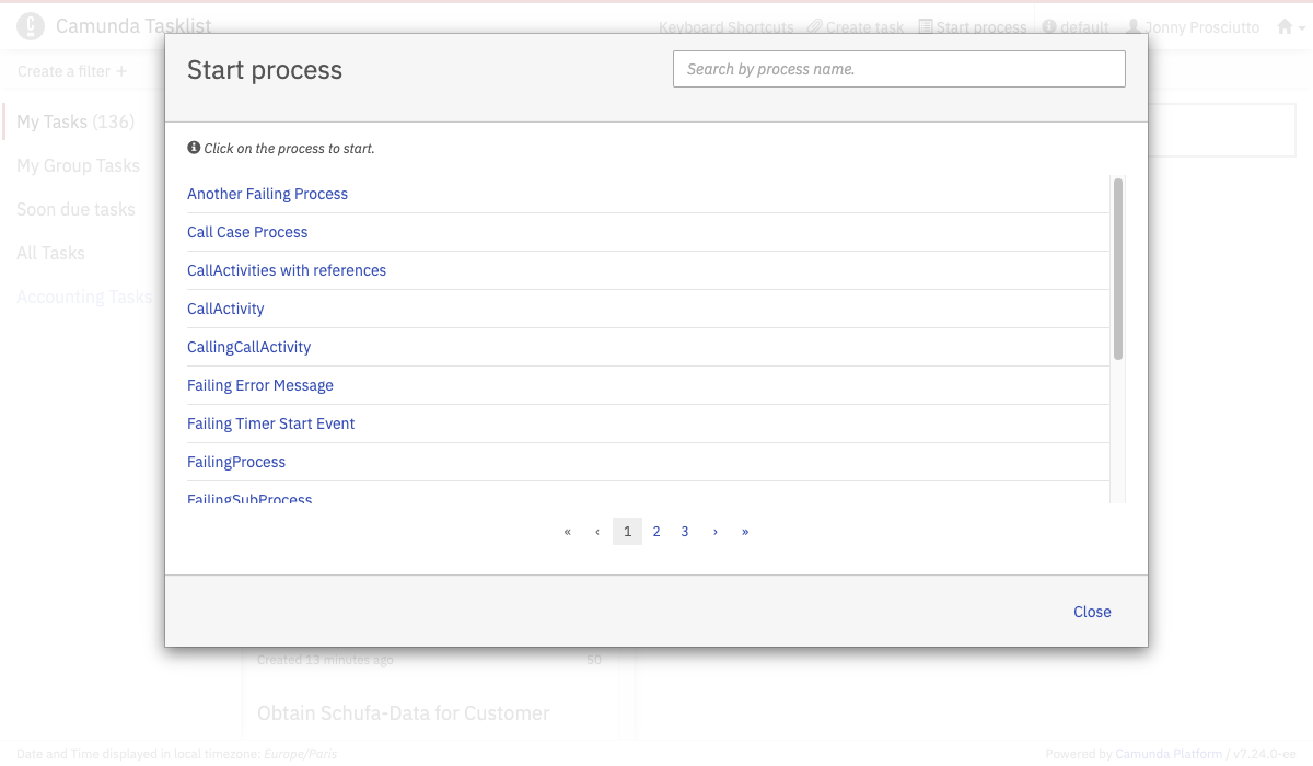 To start a process instance via Tasklist, click on Start process in the header menu and select a process out of the displayed list of process definitions. If no process definitions are listed here, please verify that your process application is deployed correctly.