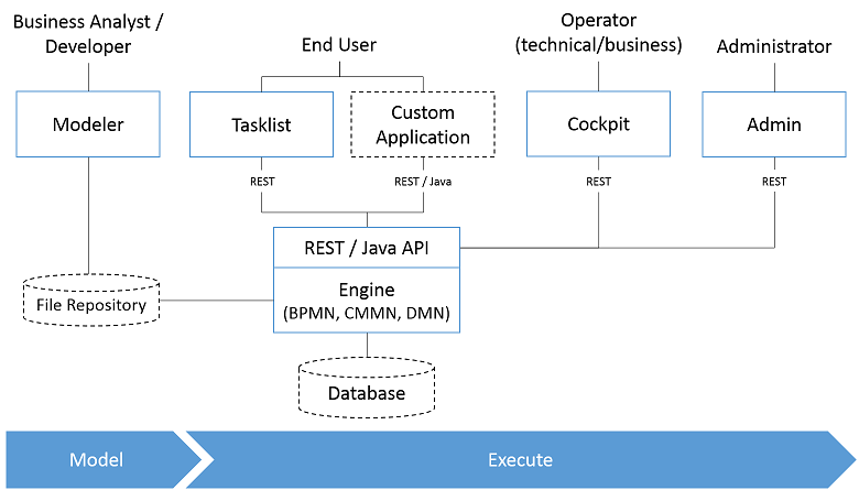 - Process Engine The process engine is a Java library responsible for executing BPMN 2.0 processes, CMMN 1.1 cases and DMN 1.3 decisions. It has a lightweight POJO core and uses a relational database for persistence. ORM mapping is provided by the MyBatis mapping framework.