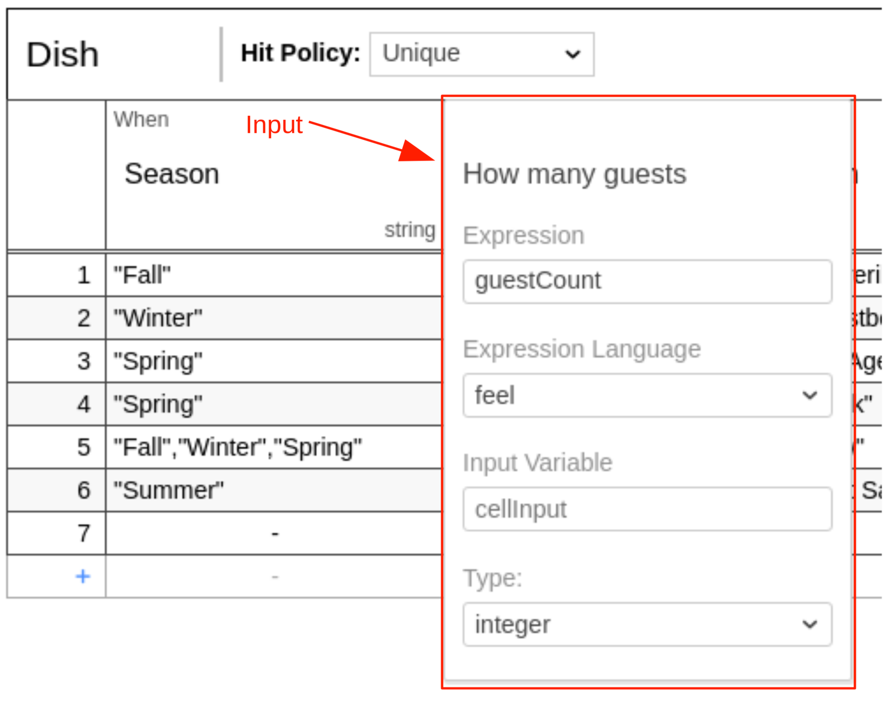 A decision table can have one or more inputs, also called input clauses. An input clause defines the id, label, expression and type of a decision table input.