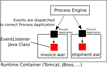 When using the process application API, the process engine makes sure that Events are delegated to the right process application. For example, assume there is a process application deployed as “invoice.war” which deploys a process definition named “invoice”. The invoice process has a task named “archive invoice”. The application “invoice.war” further provides a Java Class implementing the ExecutionListener interface and is configured to be invoked whenever the END event is fired on the “archive invoice” activity. The process engine makes sure that the event is delegated to the listener class located inside the process application:
